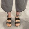 Flat con doppia fascia e chiusura laterale con fibbia regolabile. Color nero, materiale in morbido cuoio e lavorazione artigiana Made in Italy.